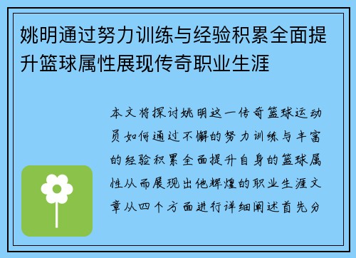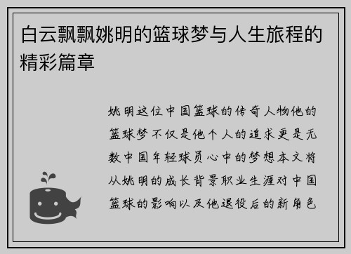 姚明,这位来自中国的篮球巨星,以其卓越的身高和出色的球技征服了世界篮球舞台。他从早期在中国职业联赛中的崭露头角,到成为NBA历史上第一位中国籍球员,姚明的职业生涯可谓是一段传奇。本文将通过四个方面深入探讨姚明的篮球传奇之路:他的成长历程、在NBA的辉煌表现、退役后的影响力以及他对篮球事业的贡献。每个方面都展示了姚明如何从一个普通少年成长为全球瞩目的体育偶像,最终入选名人堂,成为无数年轻运动员心中的...